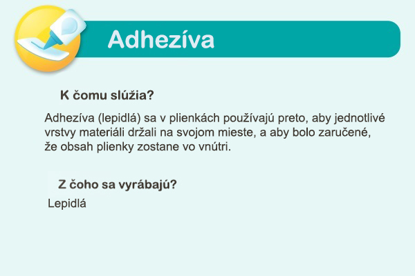 Adhezíva (lepidlá) vyrobené z termoplastických polymérov sa v plienkach používajú preto, aby držela jednotlivé vrstvy materiálov na svojom mieste a aby bolo zaručené, že obsah plienky ostane vo vnútri. Adhezíva sú na tých častiach plienky, ktoré neprichádzajú do kontaktu s pokožkou dieťaťa.