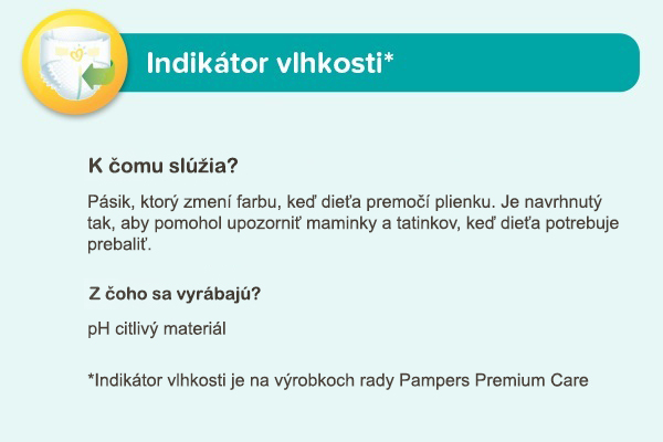 Materiál, ktorý reaguje, keď je vystavený vlhkosti. Tento materiál v podobe žltého prúžku mení farbu, keď prichádza do kontaktu s močom. Dáva tak rodičom vedieť, kedy je čas dieťatko prebaliť.