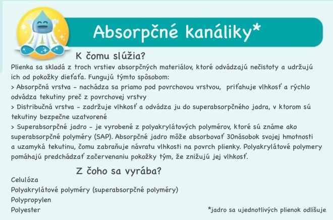 Na stránkach Pampers sú jednotlivé zložky zoradené abecedne, ja vám ich pre lepší prehľad vymenujem v poradí jednotlivých častí plienok: