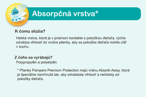 Odborníci v Pampers starostlivo vyberajú každú zložku plienky, a to tak ako na základe jej bezpečnostného profilu, tak aj vynikajúceho výkonu pri udržovaní pokožky dieťaťa v suchu a zdraví.