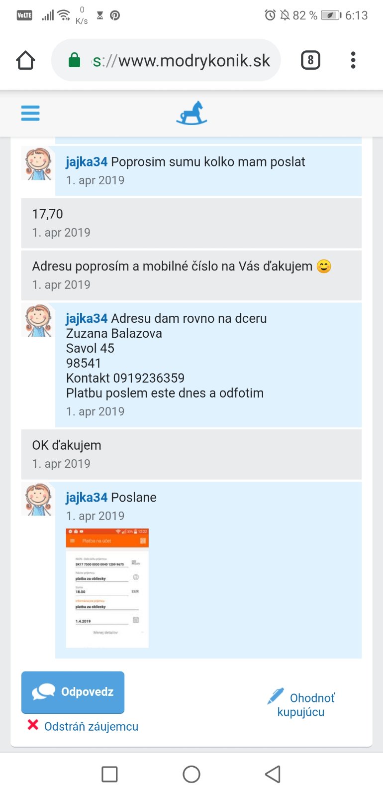 Chcem upozorniť na použivateľku jajka34 - Zuzana Balážová, Savol - už sa stihla z koníka vymazať, ale predpokladám, že si založí nový účet a bude klamať zas a znova. Kupujúca sa snaží klamať spôsobom, že pošle screen o vykonaní platby na BÚ a potrebuje vec odoslať hneď doporučene 1.trieda, aby balíček dostala na druhý deň. Je mnoho mamičiek, ktoré dôverujú a naletia jej .. takmer sa to stalo aj mne, ale našťastie som tu chybu neurobila, nemala som z nej dobrý pocit. Prosím, dávajte si pozor !!!