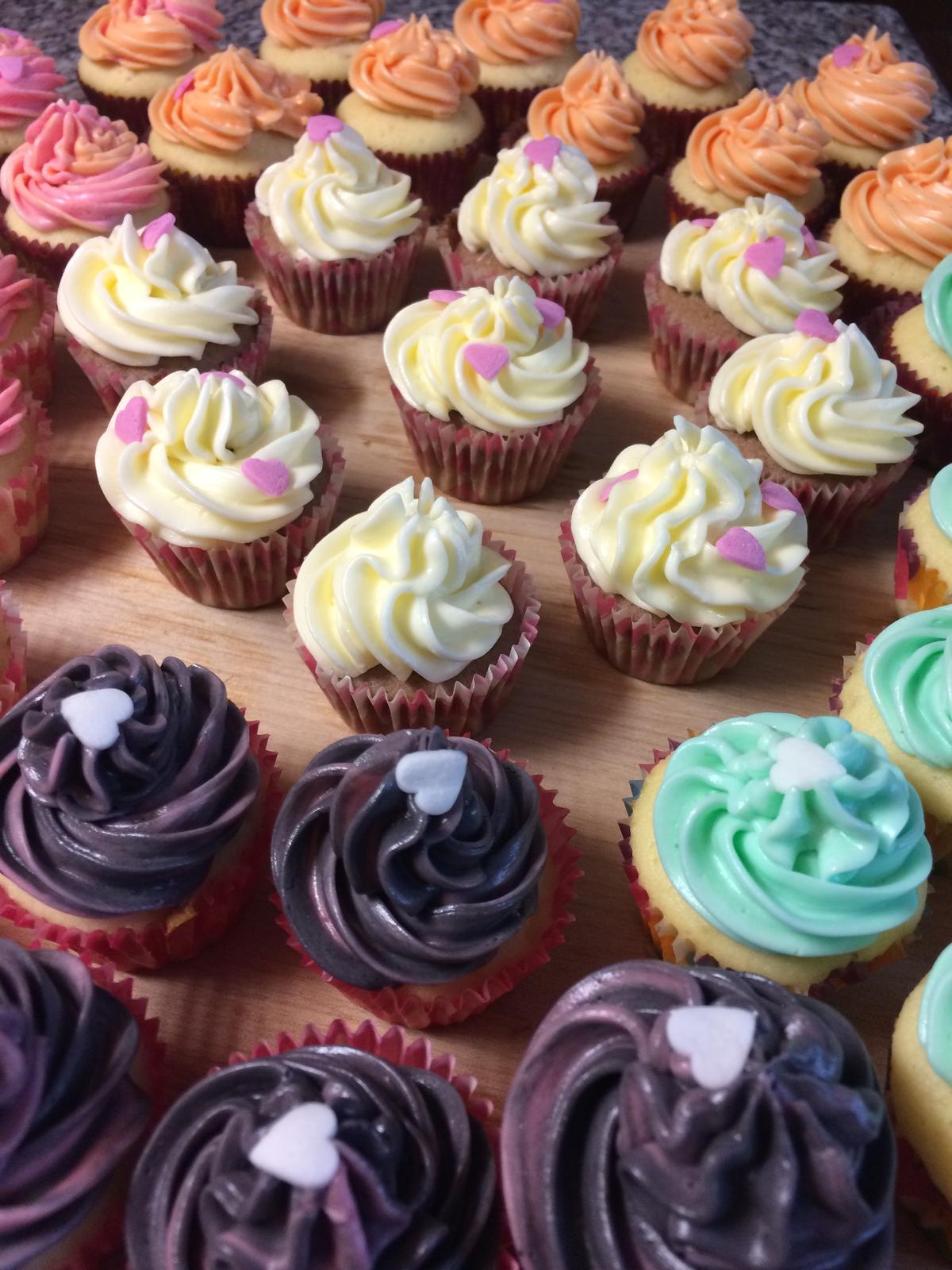 Trochu polevy som si z veľkej misky premiestnila do menšej misky, do ktorej som pridala ako prvú oranžovú farbu. Stačilo naozaj pár kvapiek, poriadne som to premiešala a naplnila sáčok so špičkami na zdobenie. Ozdobila som cca 6ks cupcakes a potom spravila ďaľšiu farebnú kombináciu v ďalšej miske 🙂 Ružová, modrá, červená a čierna nakoniec. Tej čiernej som sa trošku bála, no primiešala som ju do "červenej" polevy a tak sa mi spravil krásny preliv medzi nimi. Na niektoré som pridala ozdobné srdiečka, nie však na každé, aby to nebolo až príliš "cukríkové".