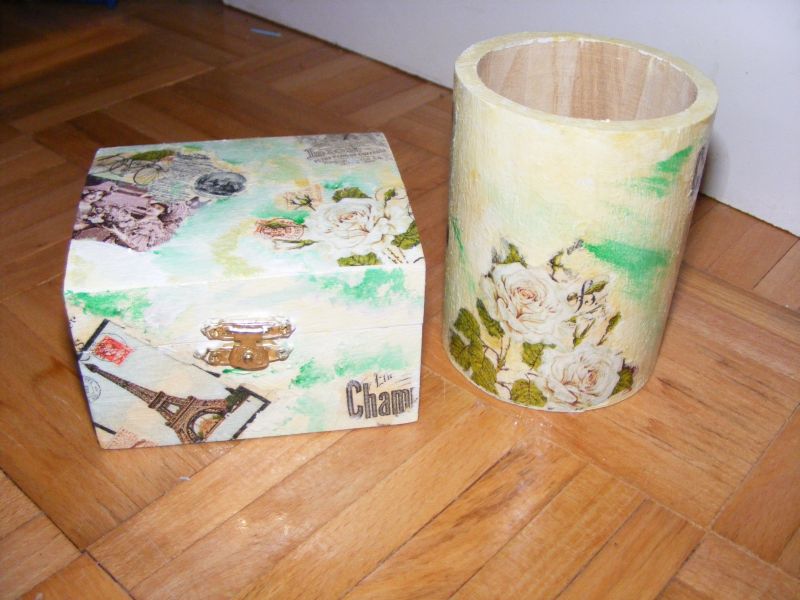 Drevená krabička a pohárik Paríž zdobené servítkovou technikou