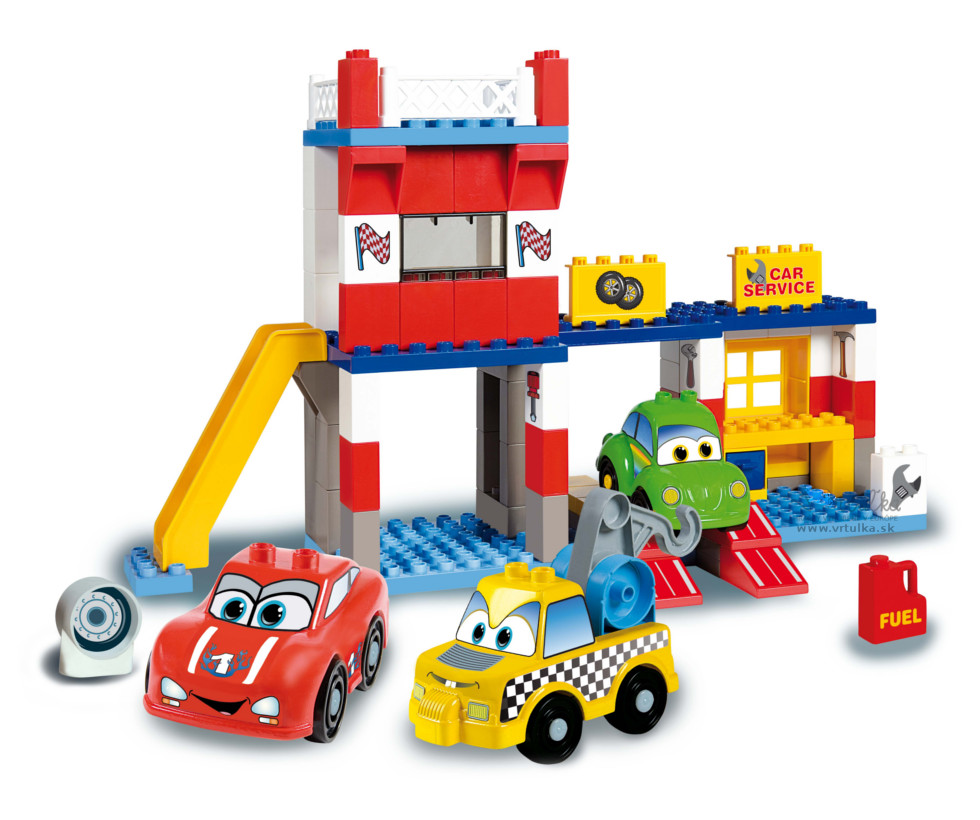 UnicoPlus Cars Autoservis. Obsahuje autoservis, 3 autíčka a príslušenstvo, spolu 108 dielikov. Cena 27,40 eur.