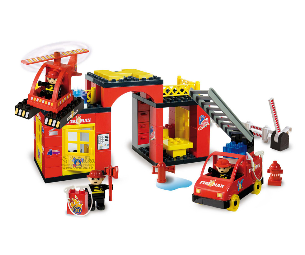 UnicoPlus Veľká Hasičská Stanica. Obsahuje hasičskú stanicu, auto, vrtuľník, troch hasičov a príslušenstvo, spolu 90 dielikov. Cena 31,90 eur.