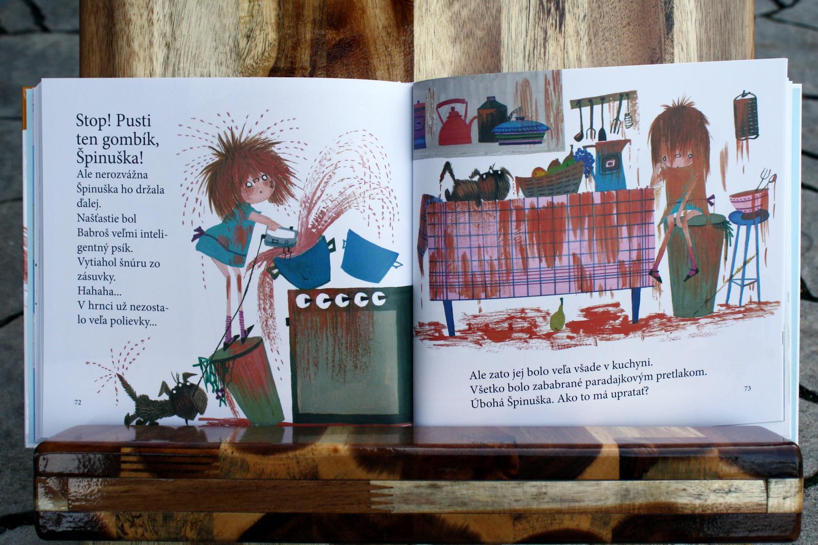 Mimi už dávno dajaká kniha nechytila tak ako práve Špinuška. Obľúbila si ju hneď. Čítali sme ju niekoľko večerov po sebe a to sa už dávno nestalo. Hocikedy cez deň sme spomínali na niektoré pasáže a smiali sa. Trochu som sa obávala, či sa na Špinušku nezačne aj hrať a že by to malo neblahý vplyv na stav jej oblečenia. To sa však neudialo. Mimi chápe, že to čo sa na stránkach knihy deje, nie je úplne bežné a občas preto moralizuje, no najmä (a to je najdôležitejšie) sa dobre baví 🙂