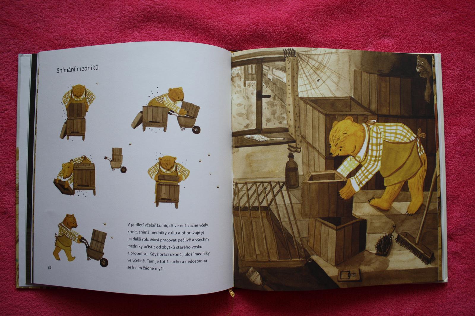 Každé ročné obdobie prináša Lumírovi iné povinnosti. Musí včelie úle vyčistiť, včielky nakŕmiť, včelu matku označiť, med zozbierať. Babička z vosku vyrobí sviečky, z propolisu tinktúru a na záver knihy upečie medovníčky.