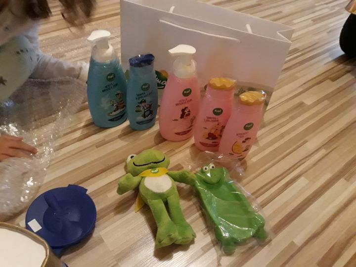 Julinka prvé objavila plyšovú žabku a zaujal ju obal z krásnou korunkou ako pre ozajstné princezné a tiež krásna vôňa... Chlapčenský set posúvame kamošovi zo škôlky a hor sa do testovania. Pri otváraní asistovala aj mladšia Viktória, ktorú zaujala polystyrénová výplň nuž možno o rok vyskúša aj ona takýto set.