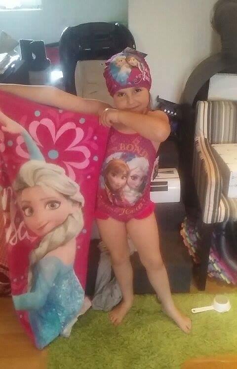 www.disneymania.skTakto sa tešila naša zákazníčka osuške, plavkám a kúpacej čapici s jej obľúbenou Elsou a Annou 🙂
