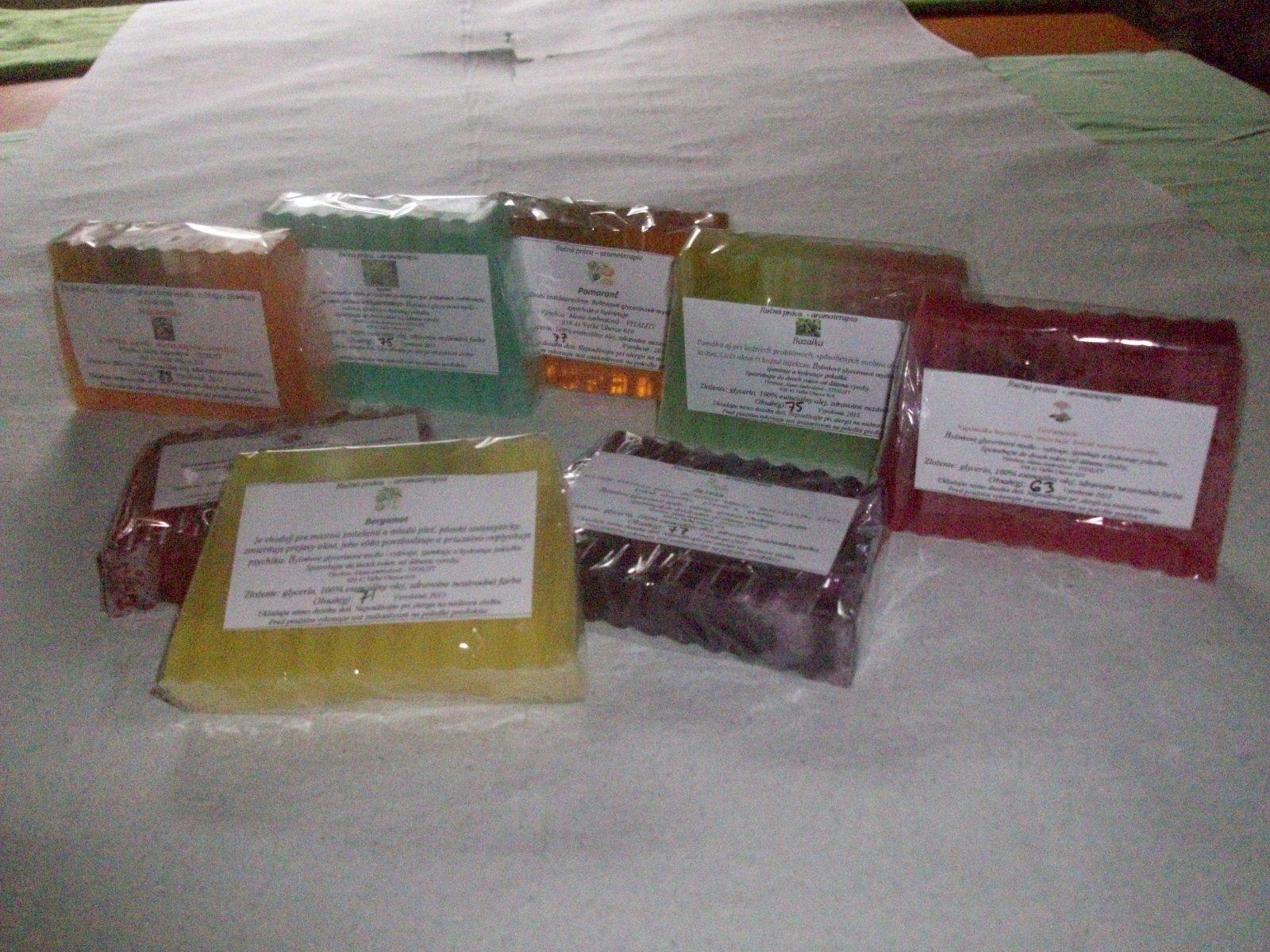 Bylinkové mydlo, balené v celofáne, váha od 60 do 110 g. Cena 1,80 - 3,30€