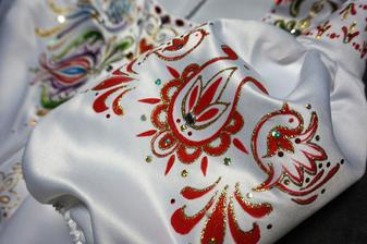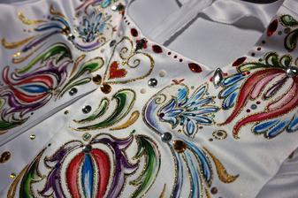 tema bola folk ...neveste som navrhla saty, kamoska usila, ja som rucne namalovala nielen saty, ale aj nadkolienky a tenisky, vytvorila k tomu megapartu s malovanymi stuhami, vizazistka dielo dotvorila a vyhrali sme ♥♥♥ 🙂