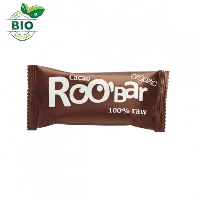 Tyčinka je vyrobená iba z tých najkvalitnejších surovín, ktoré sú spracované šetrnou metódou sušenia. Táto metóda nepresahuje teplotu spracovania viac než 42 stupňov Celzia preto, aby sa zachovali potrebné živiny zo surovín. Roobar tyčinka s nepraženým kakaom má plnú, výraznú čokoládovú chuť. Na rozdiel od čokolády však neobsahuje žiadny pridaný cukor ani tuk. Sladká je vďaka sušeným datliam. Okrem toho v nej nájdete aj mandle. Zloženie: ďatle, mandle 26%, kakaový prášok 6%. Z ekologického poľnohospodárstva.