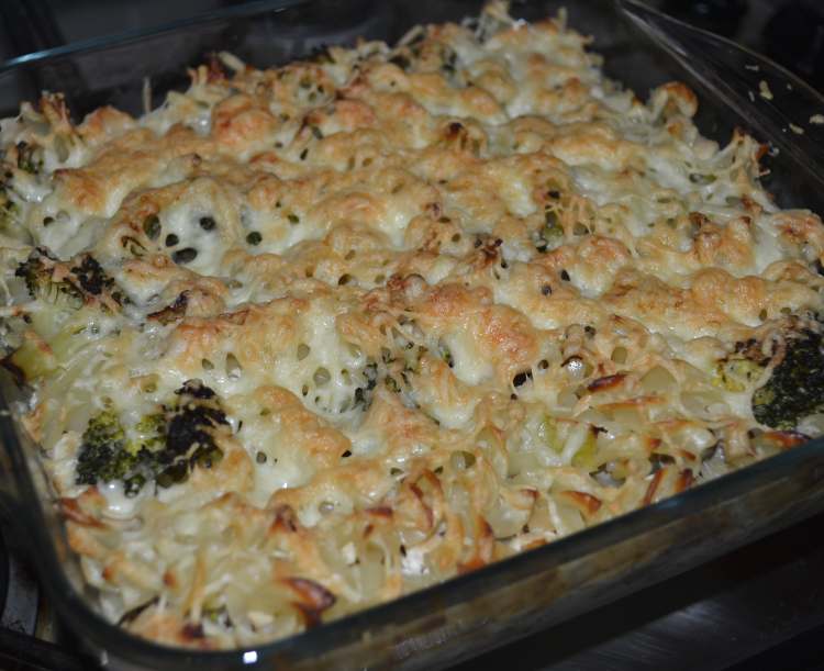 Zapekané cestoviny s kuracím mäsom, brokolicou, šampiňónmi a syrom