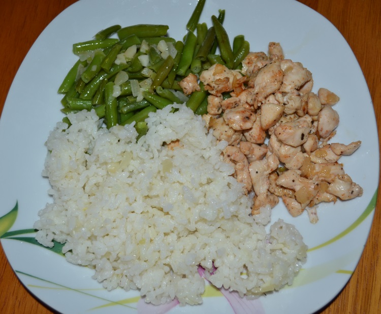 Kuracie prsia na cibuľke, fazuľky na cibuľke a cesnaku + ryža. V jednoduchosti je čaro.