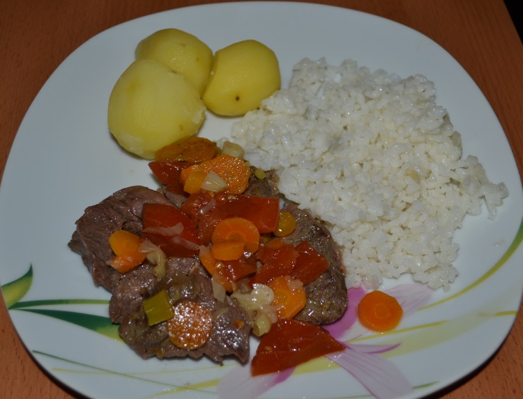 Hovädzie dusené so zeleninou (cibuľka, paradajky, mrkva) + ryža/zemiaky