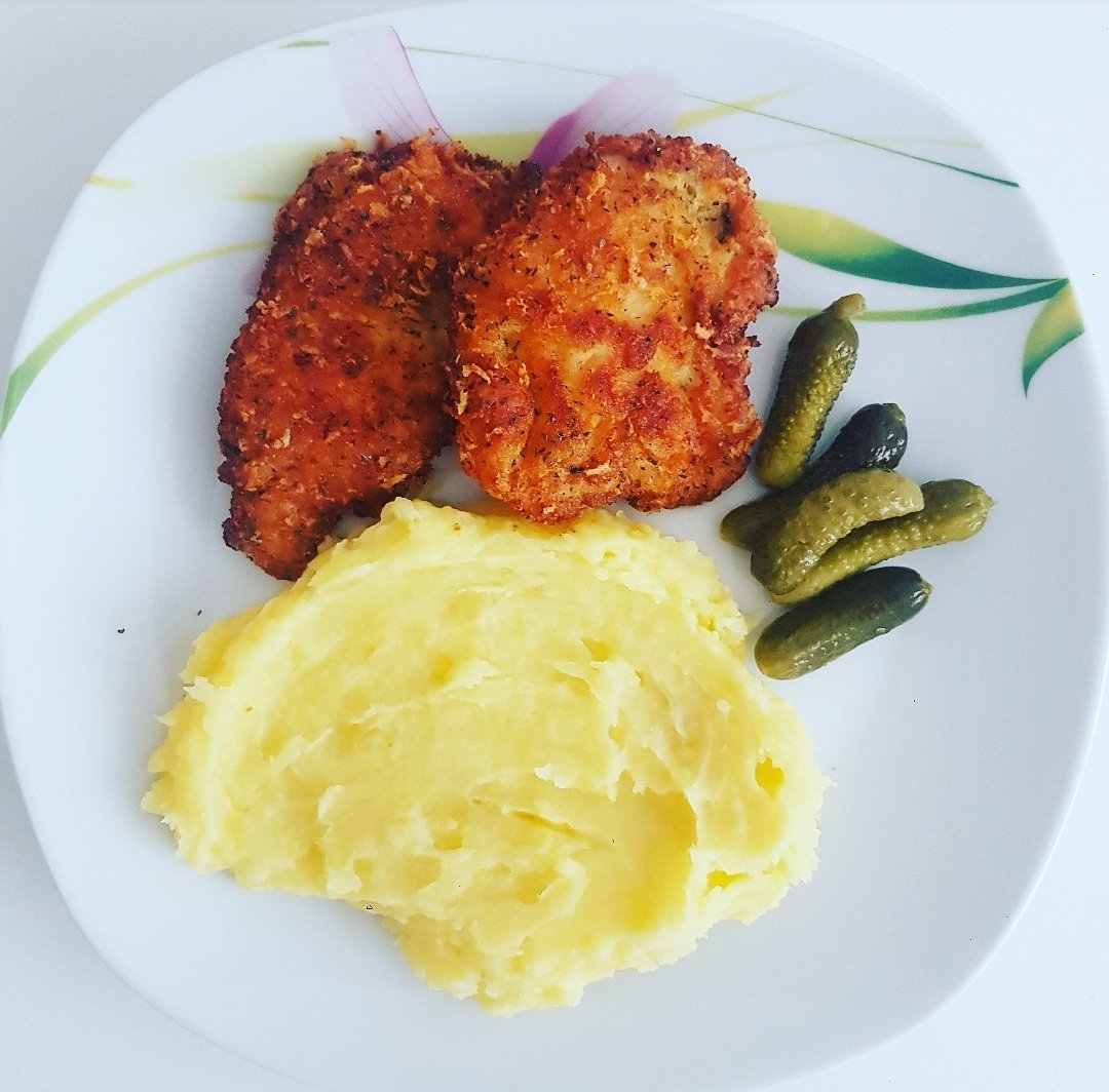 Kuracie rezne v bylinkovo-syrovom cesticku a zemiakova kaša