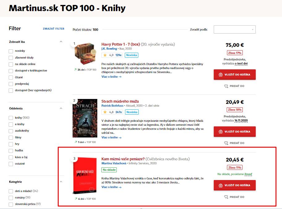 (ASI) malý krok pre knižný trh, ale veľký pre Martinu (MŇA) - teším sa, že sa kniha, ktorú som napísala počas prvej vlny korony dostala do TOP 100 na Martinuse (dnes som číslo #62). Aj to, že mi chodia skvelé referencie. Veľmi som zo začiatku pochybovala, či môže kniha ľuďom naozaj priniesť osoh. Pre mňa je rozumné hospodárenie pevne v mojej DNA a zdalo sa mi, že by to mal vedieť každý... Teším sa a ďakujem. Ak náhodou knižku máte a páčila sa, budem rada za recenziu na Panta či Martinus. Krásny víkend...