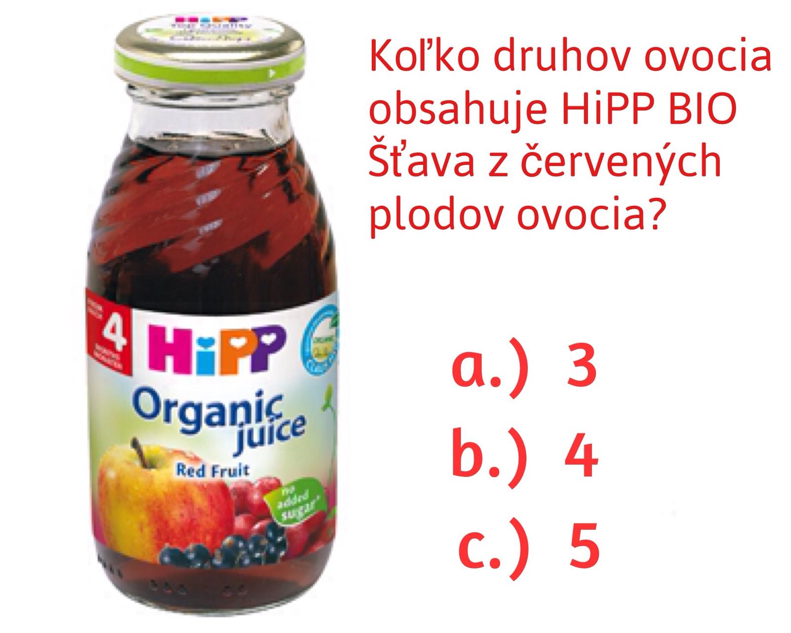Ahojte 🙂 správna odpoveď je B, HiPP BIO šťava z červených plodov ovocia obsahuje jablkovú šťavu, šťavu z červeného hrozna, aróniovú šťavu a šťavu z čiernych ríbezlí 🙂 letia 💙💙💙 Pekný večer 🙂