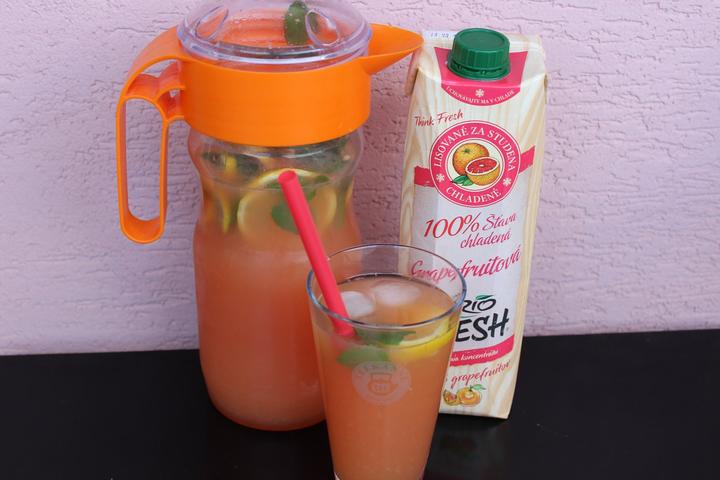 osviezuuca FRESHonada v podani @katy1111 🙂"pridala som cirónovu šťavu, vodu, ľad,mätu,plátky citrónu a rio fresh grepový a je to mňam 🙂 "
