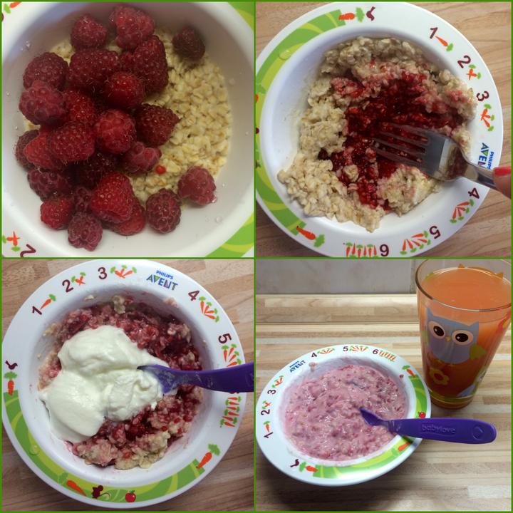 ovsene vlocky zaliate vriacou vodou aby napucali, potom pridame malinky, popucene vidlickou, a nakoniec zmiesane s troskou bieleho jogurtu! a pre maminku pohar grepoveho #riofresh