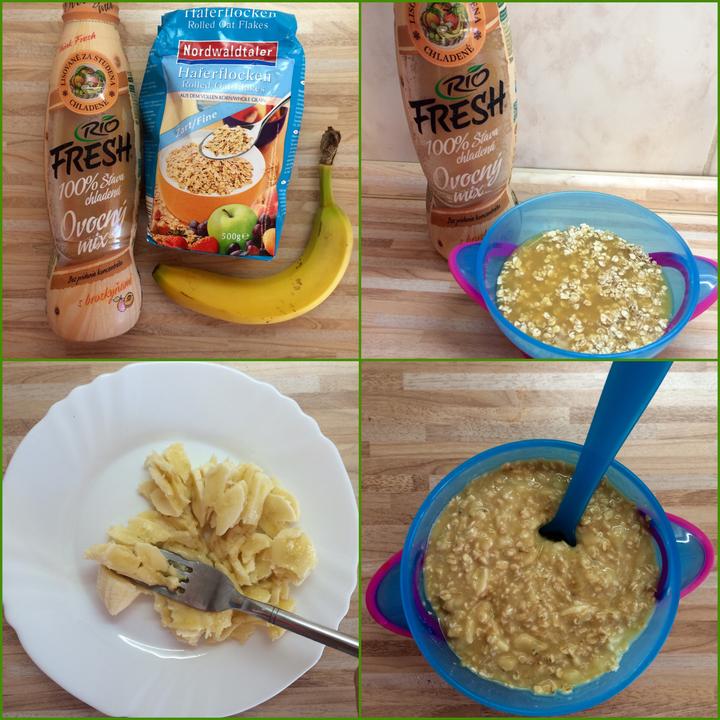 Tominkove dnesne ranajky 😊 potrebujeme #riofresh ovocny mix s broskynou, jemne mlete ovsene vlocky a bananik.. vlocky zalejeme freshom aspon na 20minut aby zmakli a napucali, a potom primiesame vidlickou popuceny bananik a super chutne zdrave ranajky su na svete 😊👌🏻