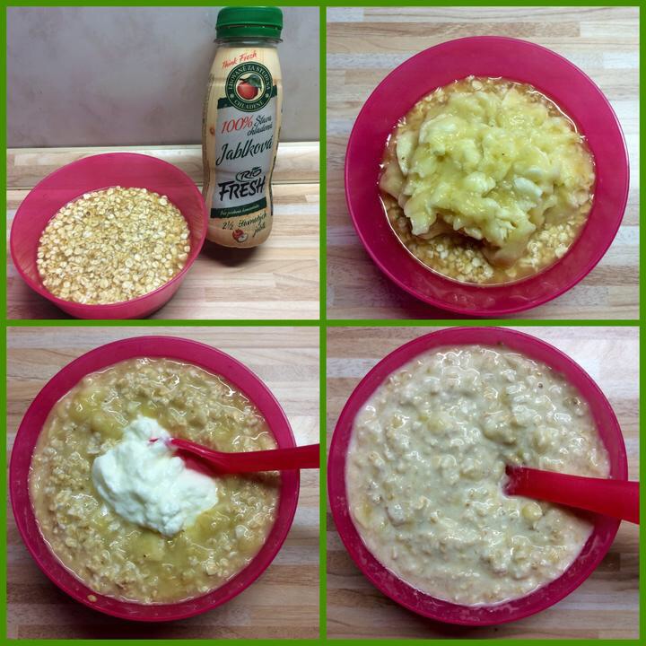 ominkove dnesne ranajky.. jemne mlete ovsene vlocky zaliate jablckovym #riofresh na 20min aby zmakli a napucali.. potom som pridala vidlickou popuceny bananik a dve lyzice bieleho jogurtu 😊👌🏻 rychla a zdrava mnamka!