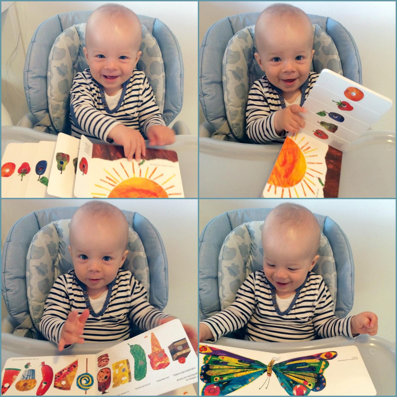 autorje ozaj super! mimo toho ze su krasne obrazky a zaujimavo zrezane stranky, vid prva foto, da sa na nej ucit pocitat, farby, typy ovocia, druhy jedla, zistenie ze list (teda nieco zelene- zeleninka) pomoze husenicke od bolaveho bruska... poucenie ze sa netreba prejedat... a vsetko ma samozrejme stastny koniec... 🙂 ja som jednoducho NADSENA! 🙂
