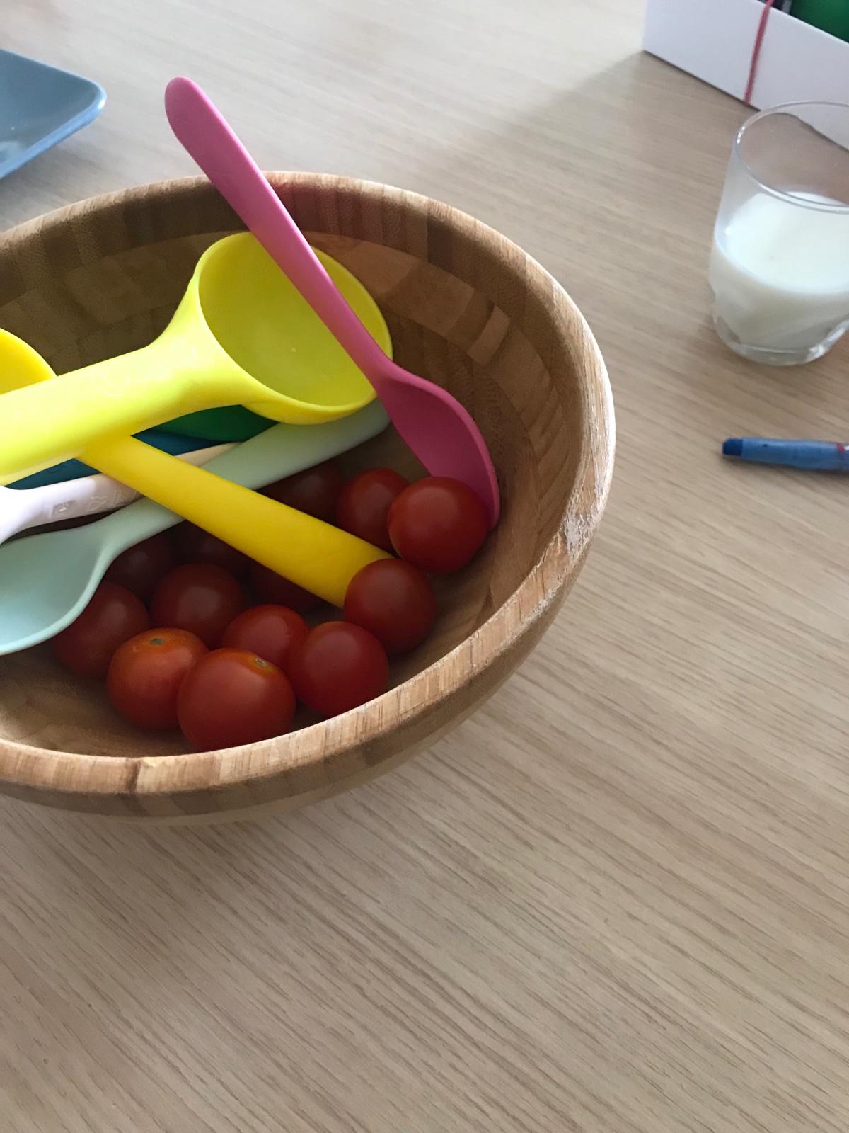 Mini paradajky, miska, lyzicky, druha miska, a je to.