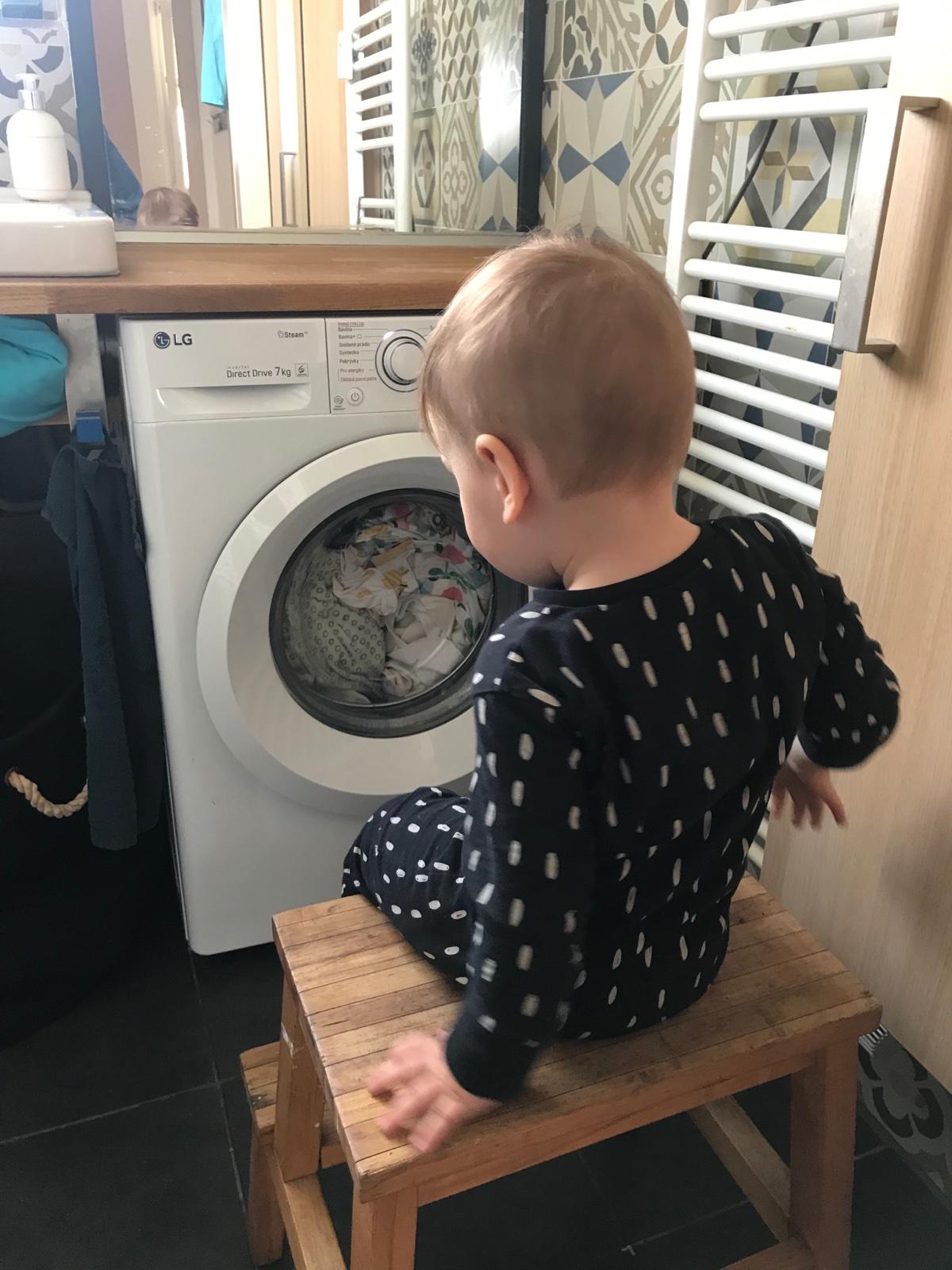 Sledovanie plyšového dinosaura v práčke.