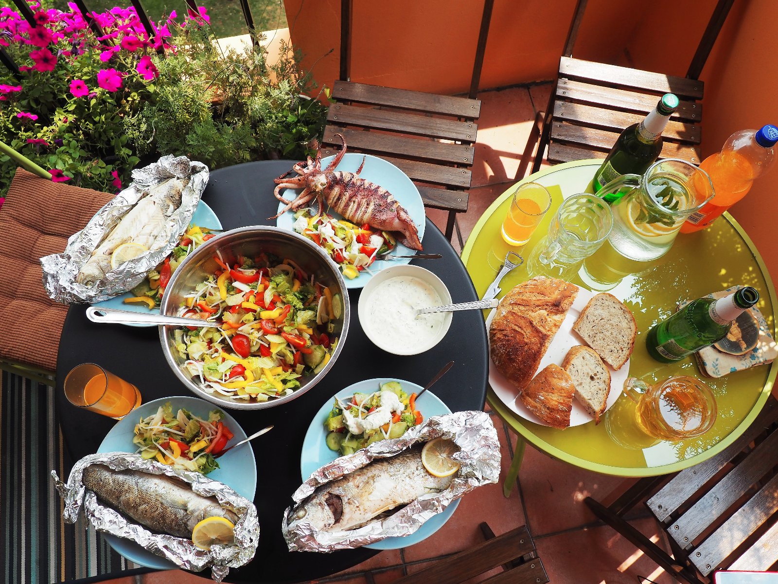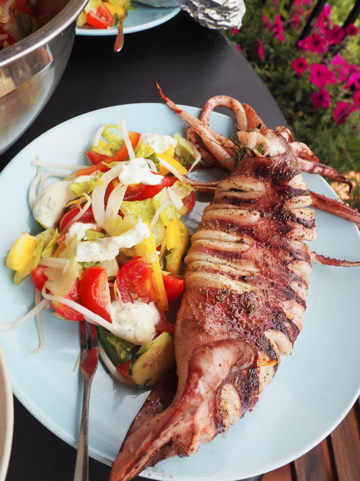 Yummy grilovany obedik dnes ❤️Grilovana rybka s citronovou travou a tymianom, grilovana chobotnicka...k tomu salatik s bambusovymi klickami a fenyklom, koprovo-cesnakovy dip a domaci chlebik z hrnca ❤️