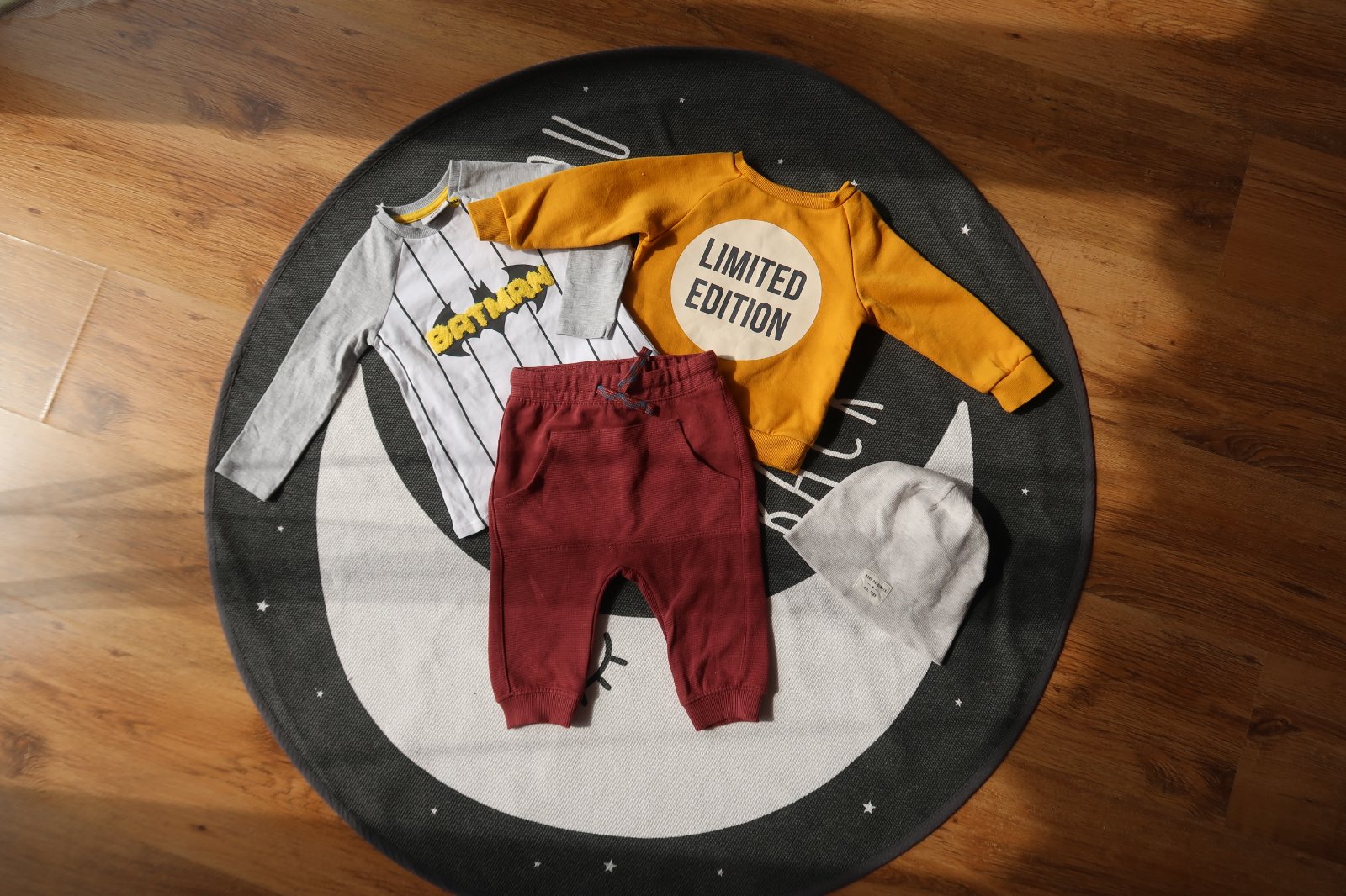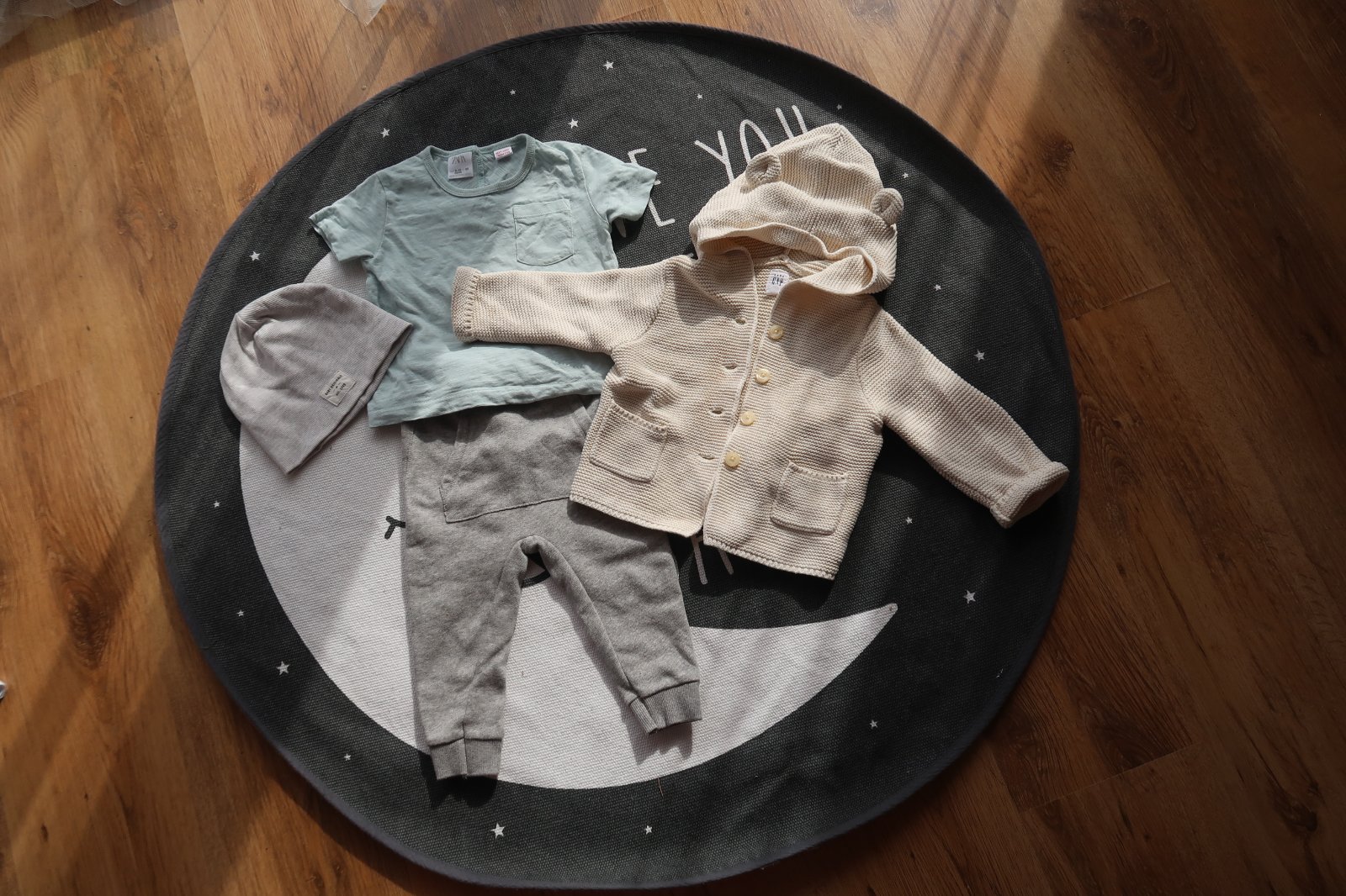 (Čiapka H&M, tričko + nohavice Zara, svetrík GAP)