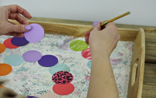 Ako prvé, dno podnosu podlepíme akýmkoľvek farebným papierom, pekne uhladíme prípadné nerovnosti, aby sa nám dobre hralo. Potom si vyrežte kruhy z rôznofarebných papierov. Naznačíme si na podnose cestu ako budeme jednotlivé kruhy lepiť na podnos. Mali by sme ich klásť od začiatočného bodu až po naznačený koniec.