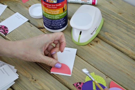 Budeme potrebovať ďalšie várky farebných kruhov, tie prestrihneme na polovičku a budeme ich lepiť na kartičky tak, aby korešpondovali s farebnosťou kruhov nalepenými na podnose. Kartičky uložíme na seba. A sme pripravení 🙂