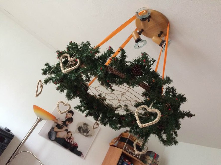 Zmena venca z jesenného na vianočný. Girlanda je z obchodu, ale srdiečka som poctivo háčkovala. :-)
