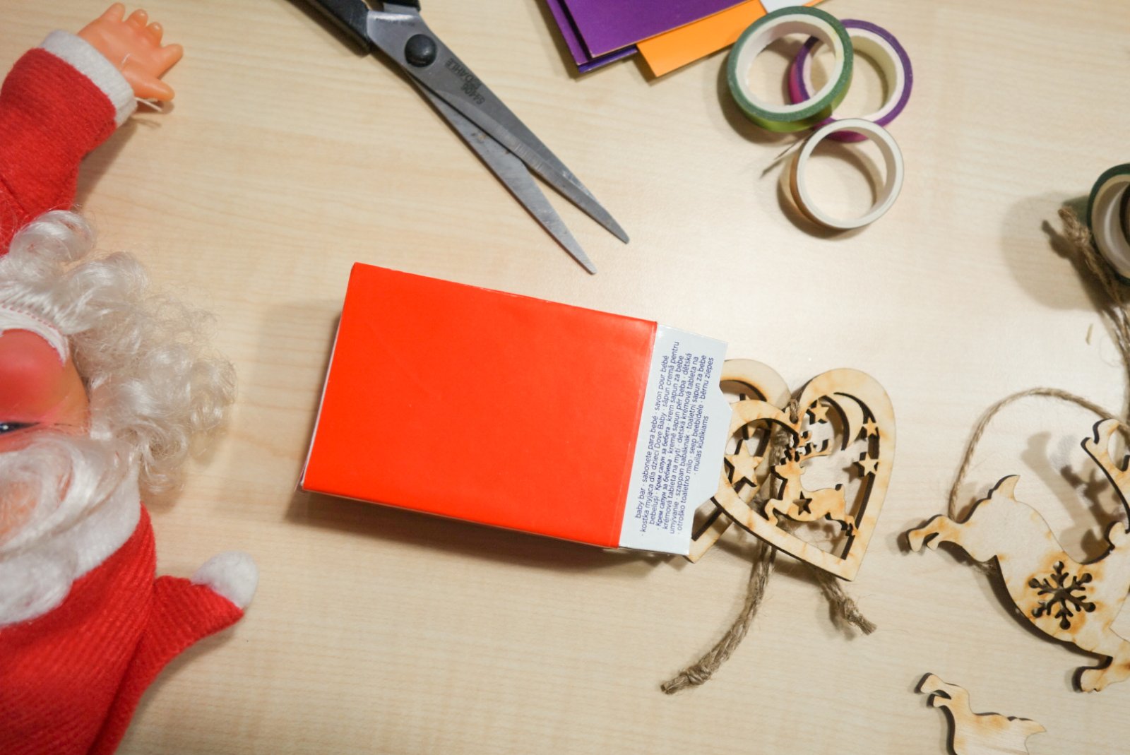 Postup je úplne jednoduchý. Farebný papier si postriháme tak, aby sedel tvarovo s krabičkou, ktorú ním oblepíme.