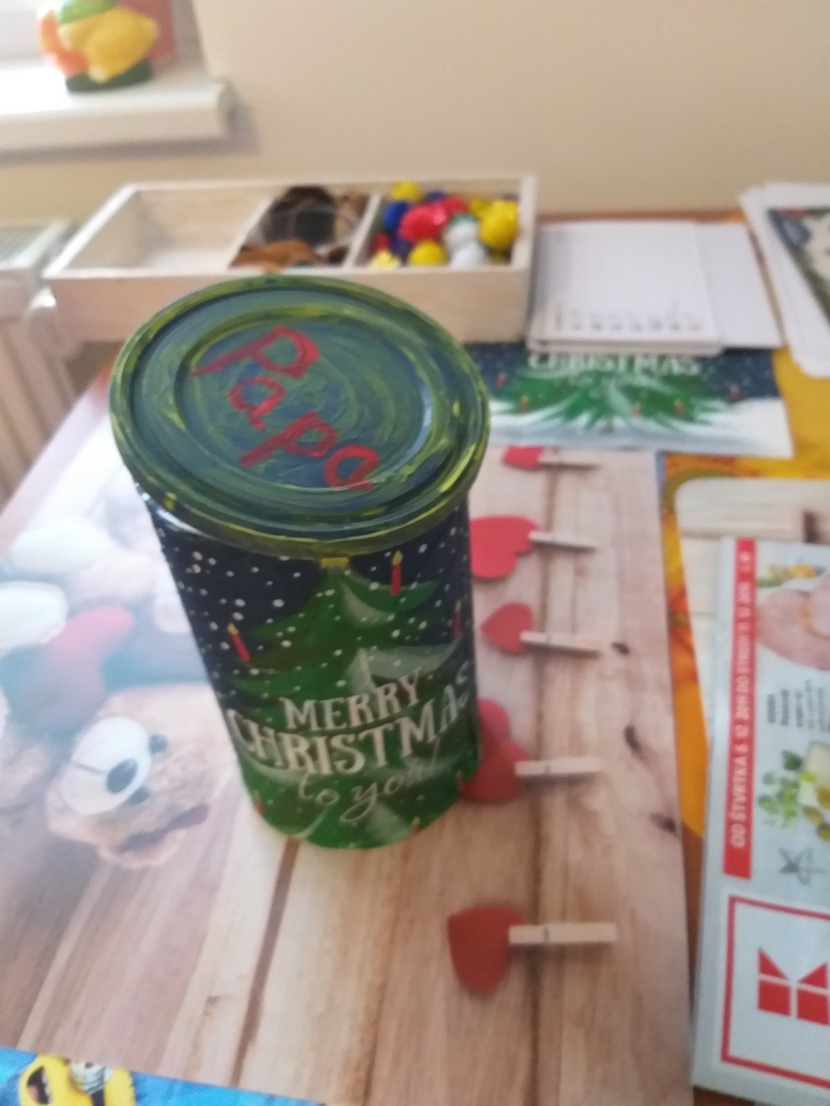 My sme takto zuzitkovali staru dozu na kavu, nalepili na to setvitku a vrchnak polalovali akrylovymi farbami. A schovali do toho tricko pre dedka