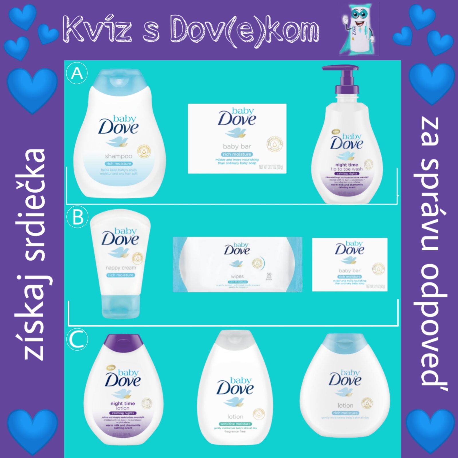 Stačí priradiť písmenko (A, B, C) k číslu so správnou odpoveďou - pri akej činnosti sa používajú vybrané produkty značky #baby_dove 🕊️