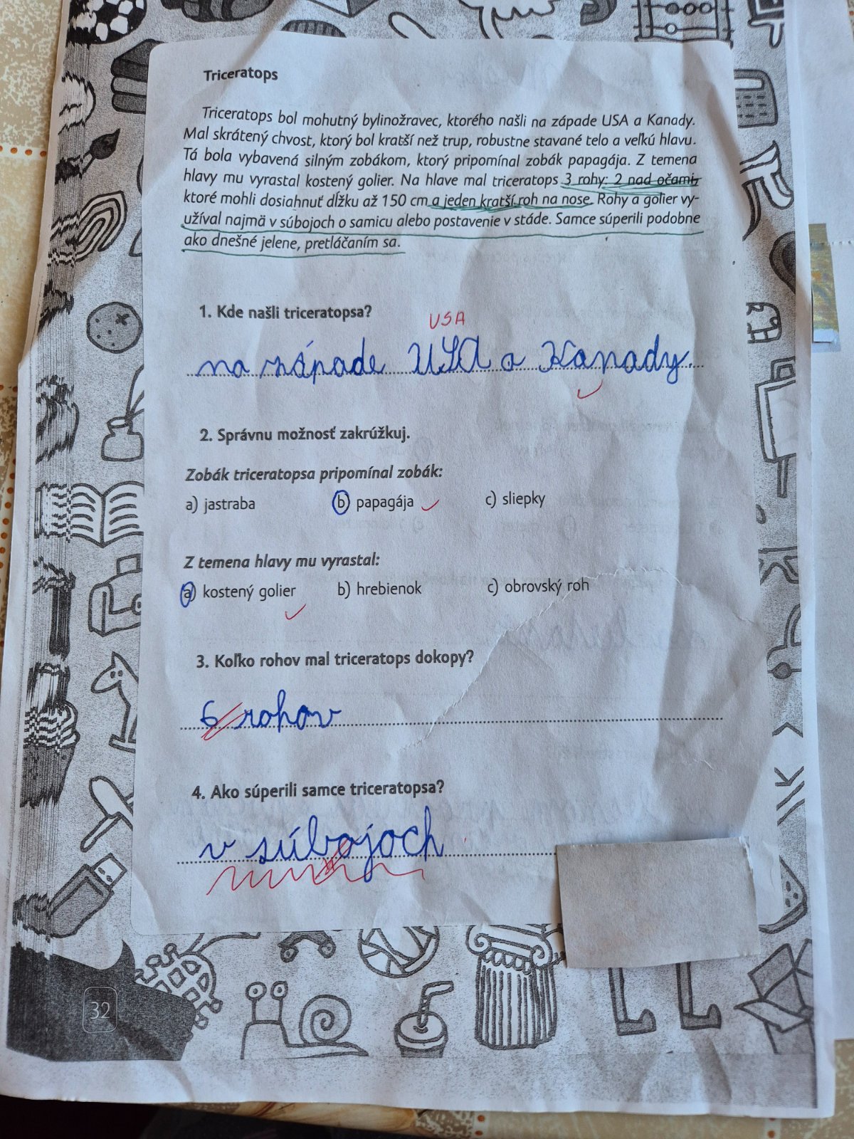 To 6 rohov je úplne bežná odpoveď. Proste sa učia násobilku a bol v tom, že má byť 3x2. A to v súbojoch. Čo ja viem. Tú vetu načo používali rohy nemusela dať do textu vôbec. Alebo mu mala podľa mňa uznať aj, že súperili v súbojoch , lebo aj pretláčanie je druh súboja. Ak chcela odpoveď pretláčanie, tak by mala byť otázka: Aký typ súboja používali?