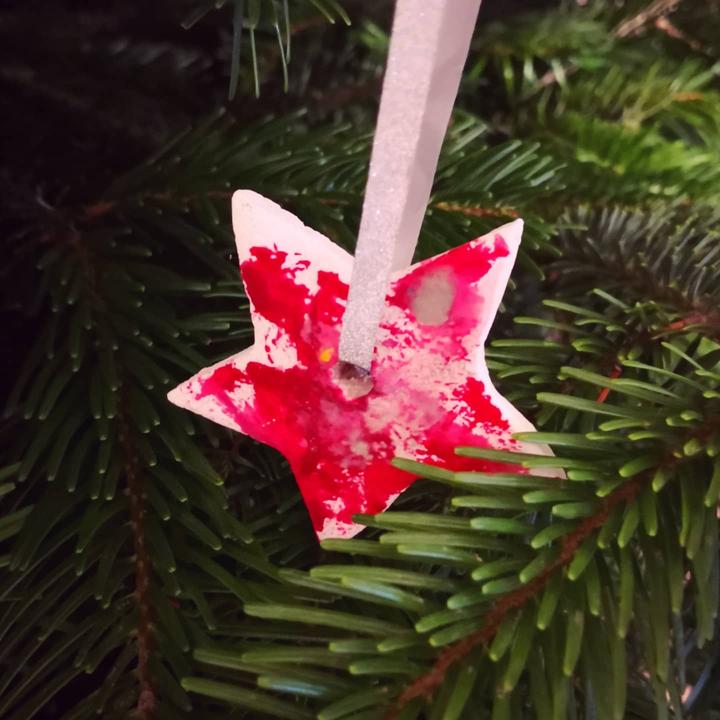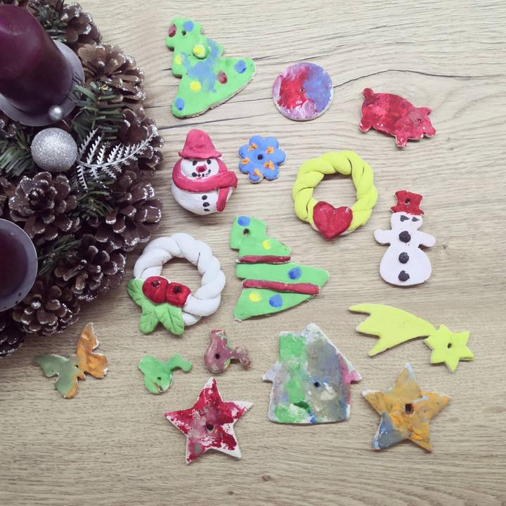 Farbenie. Použili sme úplne obyčajné temperky. Keďže samozrejme bolo všetko naokolo vrátane nás zaondené, tak temperky idú aspoň ľahko umyť. 😁 Pýtalo by si to aj nejaké trblietky, ale mama nekúpila. (Podarilo sa mi Liama ukecať, aby neprefarboval 3458x traktory a namaľoval aj pár iných ozdôb.)