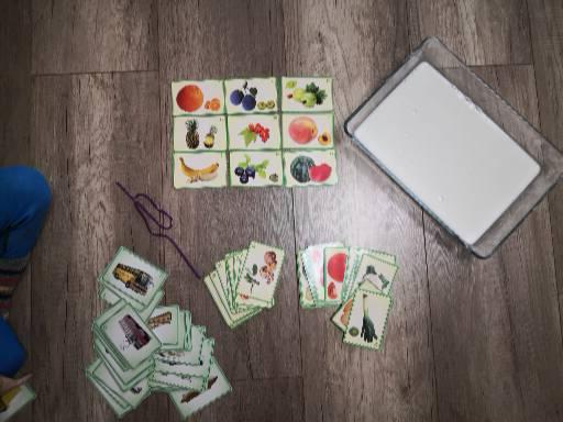 Hľadali sme a opakovali si obrázky ovocia a zeleniny. Môžete použiť akékoľvek obrázky, kartičky, kresby, nálepky, písmenká... čokoľvek tématické, čo váš krpec aktuálne uznáva. Ja som bola donútená doniesť zas raz aj dopravné prostriedky. Prejde táto bagrová mánia niekedy? 🤷♀️🤦♀️