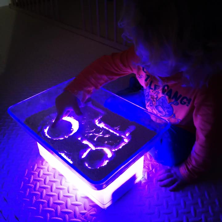 ➡️ Vianočné svetielka na baterky dáme do krabice, na ktorú položíme priehľadnú tácku. Ja som použila sklenenú jenskú misu na pečenie. Vysypeme tenkú vrstvu múky, zhasneme, všimneme si napätie v očiach malých zvedavcov, začneme čmárať a užívame si jasanie a žasnutie krpcov, ktorým to pripadá ako kúzlo. 🥰