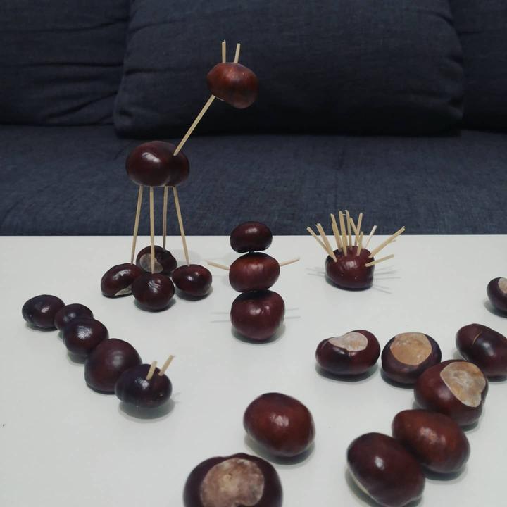 Do euroobalov som dala brmbolce, orechy, slamky a drevené kolíčky a prilepila, na zem lepiacou páskou. Môžete použiť aj hocičo iné (cestoviny, kamienky, hubky, konáriky...)