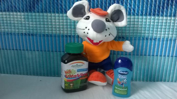 1. Multivitamín Vita Vim Kids, plyšáčik elmex (pre dievčatko Mexxi , pre chlapčeka Elmo) a sprchový gélik Bübchen (rúžový alebo modrý).