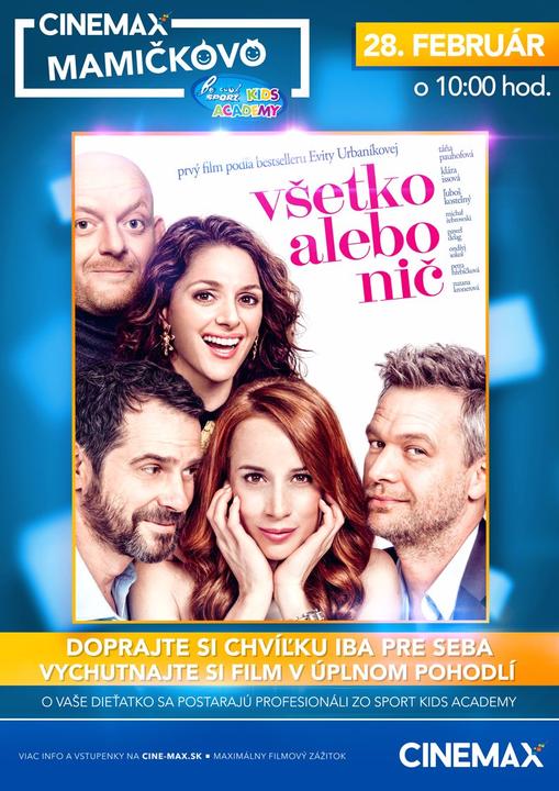 ...ktoré Vám 1x v histórii prináša možnosť navštíviť kino už počas materskej a to už zajtra 28.2.2017 o 10.hod. Kým si vy pozriete mega úspešný film "Všetko alebo nič", Vaše detičky sa zahrajú v Sport Kids Academy pod dozorom odborníkov.