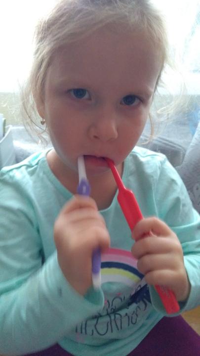 Livinka bola spokojná s kefkou, jej je v podstate jedno akú kefku používa. U nej je dôležité ,aby si mohla umývať zúbky. Už sme ich vyskúšali xy. Ako vidíte na fotke, tak aj tu hneď obe musela vyskúšať. Aj svoju starú aj tu novú. Asi po týždni sa štetinky zničili :( S pastou sme boli spokojné obe. A hlavne, jej obsahom a zložením, keďže nevypľúva pastu po umytí zúbkov.
