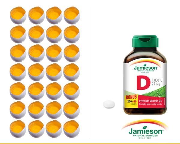 28 uvarených vaječných žĺtkov je potrebných na získanie dennejj dávky vitamínu D v zime. Jedna tabletka Jamieson vitamínu D 1000 IU obsahuje toto množstvo v jednej tabletke. #jamieson