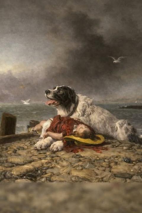 Na plátne novofundlandský pes hľadí do diaľky, po jeho boku spočíva zachránené dieťa.