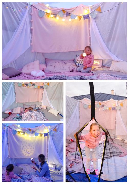 Premena trampolíny na čarovné miesto oddychu💫 Základ sú svetielka, deky, vankúše, záclony alebo závesy a štipce😉 Natálka si to dnes nesmierne užila, ja som si zaspomínala na detstvo a stavanie bunkrov. Sledovali sme oblaky, skákali, ležali, pozorovali západ slnka a nakoniec si premietli rozprávku. Veľký zážitok 💕