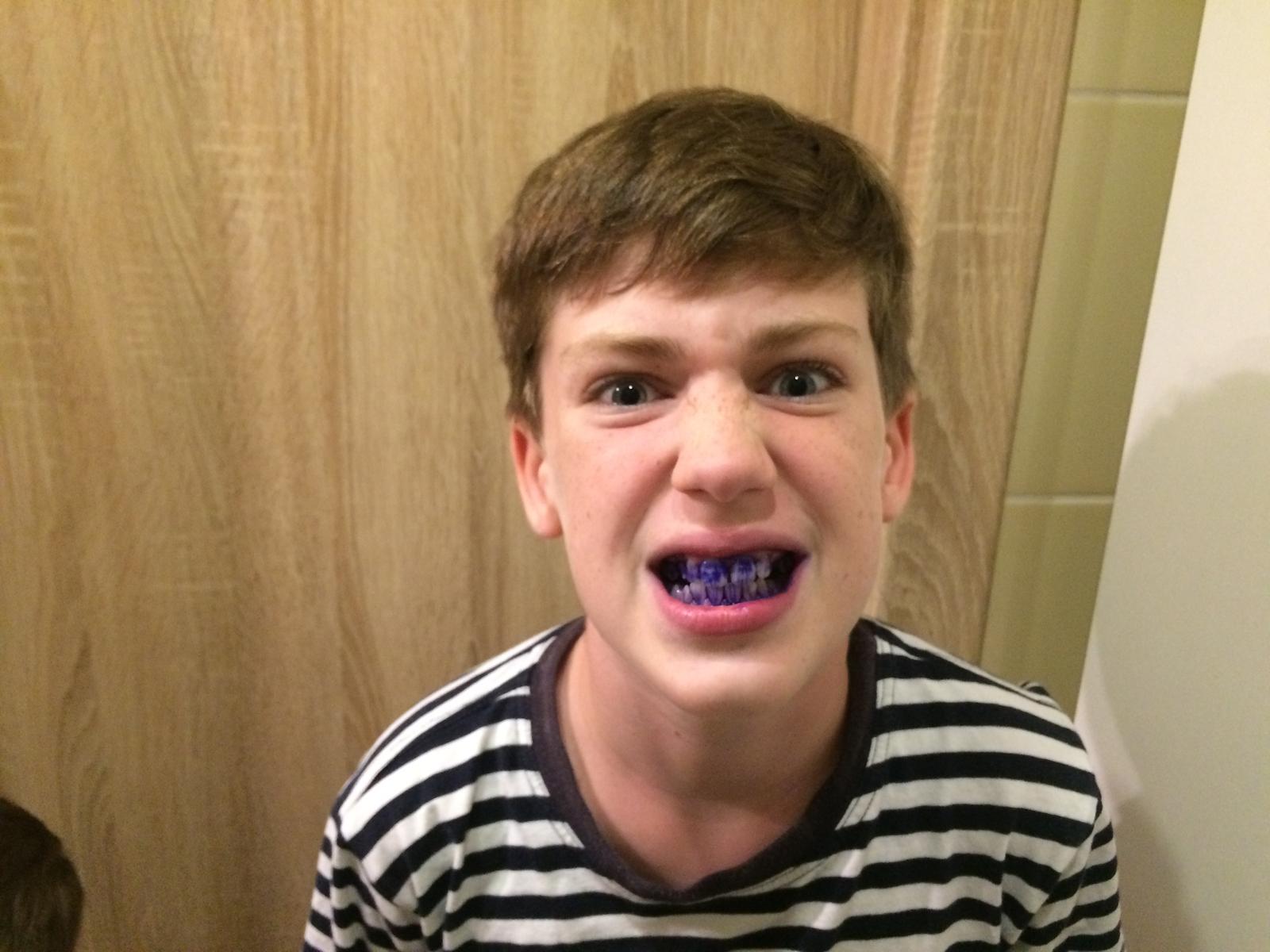 Nastala chvíľka pravdy a ja obom nanášam fialovú vodičku na zúbky po druhý krát. V napätí obaja vypláchnu vodou a tu sú výsledky: Miško sa pri čistení veľmi snažil a vyzerá, že Povlak tento útok naozaj neprežil. Zišlo by sa však pozrieť sa na zúbky aj z vnútornej strany a na stoličky. Na prvý krát je to ale super výsledok!