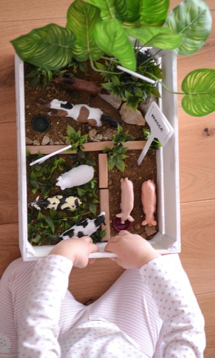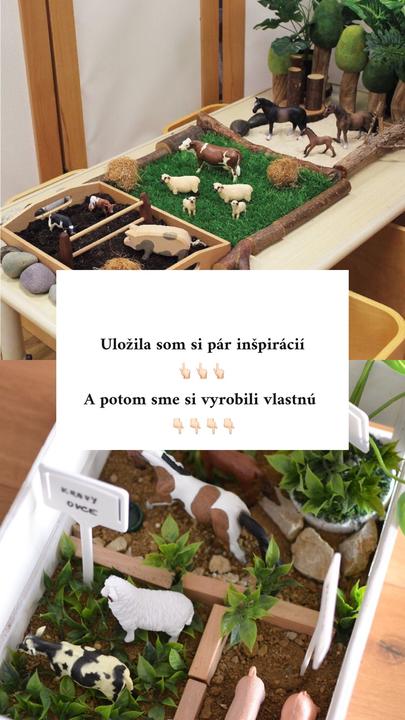 S Natálkou sme vyrobili “mini farm”. Naozaj jednoduchá a lacná záležitosť a veci z Pepco. Kúpili sme tam debničku, zvieratká a umelé kvetiny . Pridali hlinu, pár kociek na plot a vrnáčiky, ako nádoby na vodu 🙂